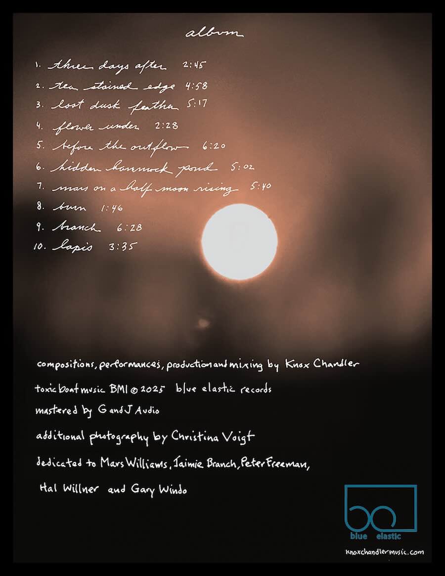 The visual portion is a book of paintings, photographs, sketches and written meditations, interpreting nature through technology. The blending of these mediums is Knox’s attempt to make the diaristic intent of his music explicit.